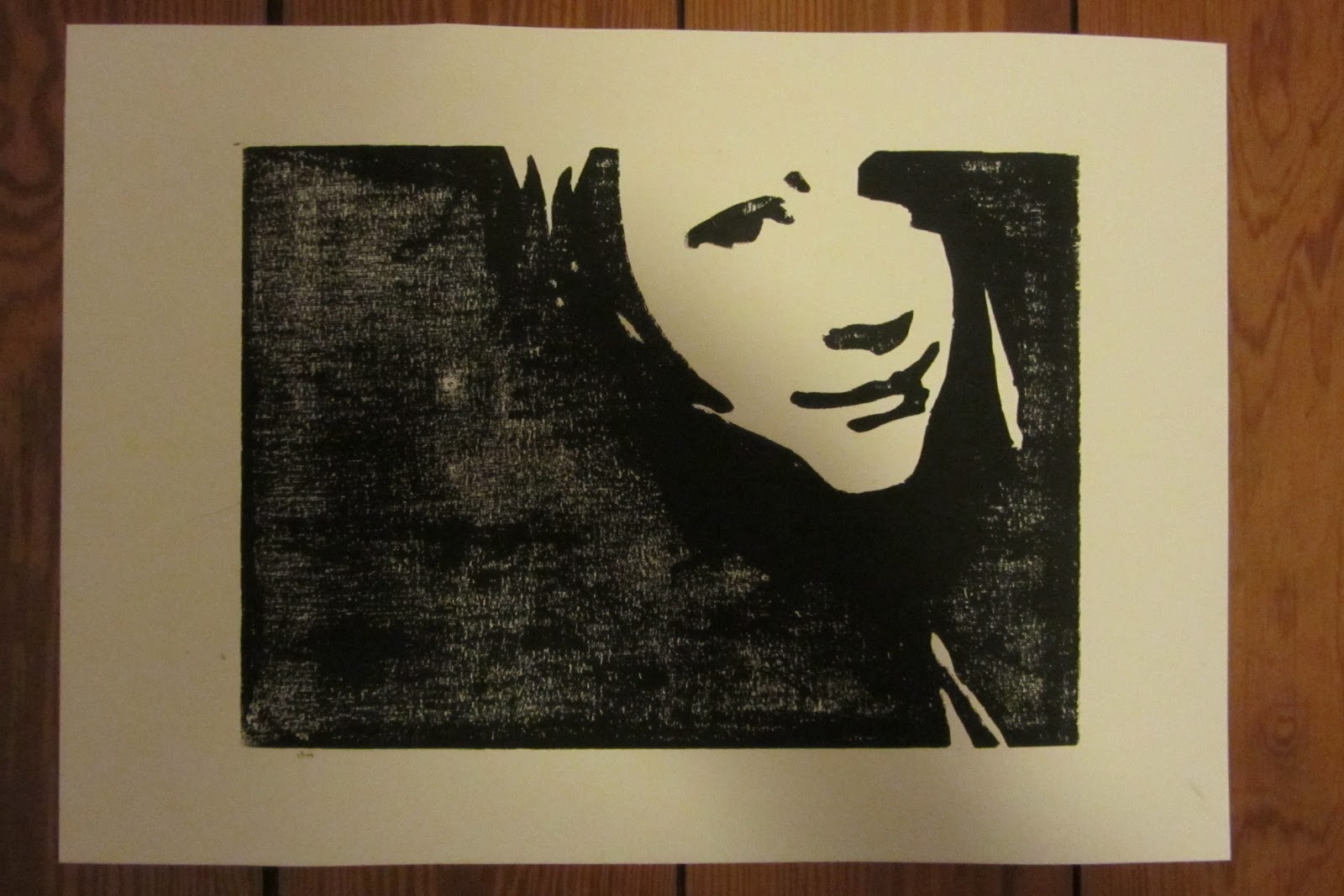 Eine Bekannte von mir hatte vor Weihnachten ein schönes neue Profilbild bei Facebook eingestellt, dass sich hervorragend als Vorlage für einen Holzschnitte eignete. Die Gesichtszüge von ihr zeichneten sich auf dem Foto wunderbar ab und man konnte ihr sympathisches Gesicht auch sehr gut reduziert auf schwarz weiß in klaren Formen wiedererkennen.
