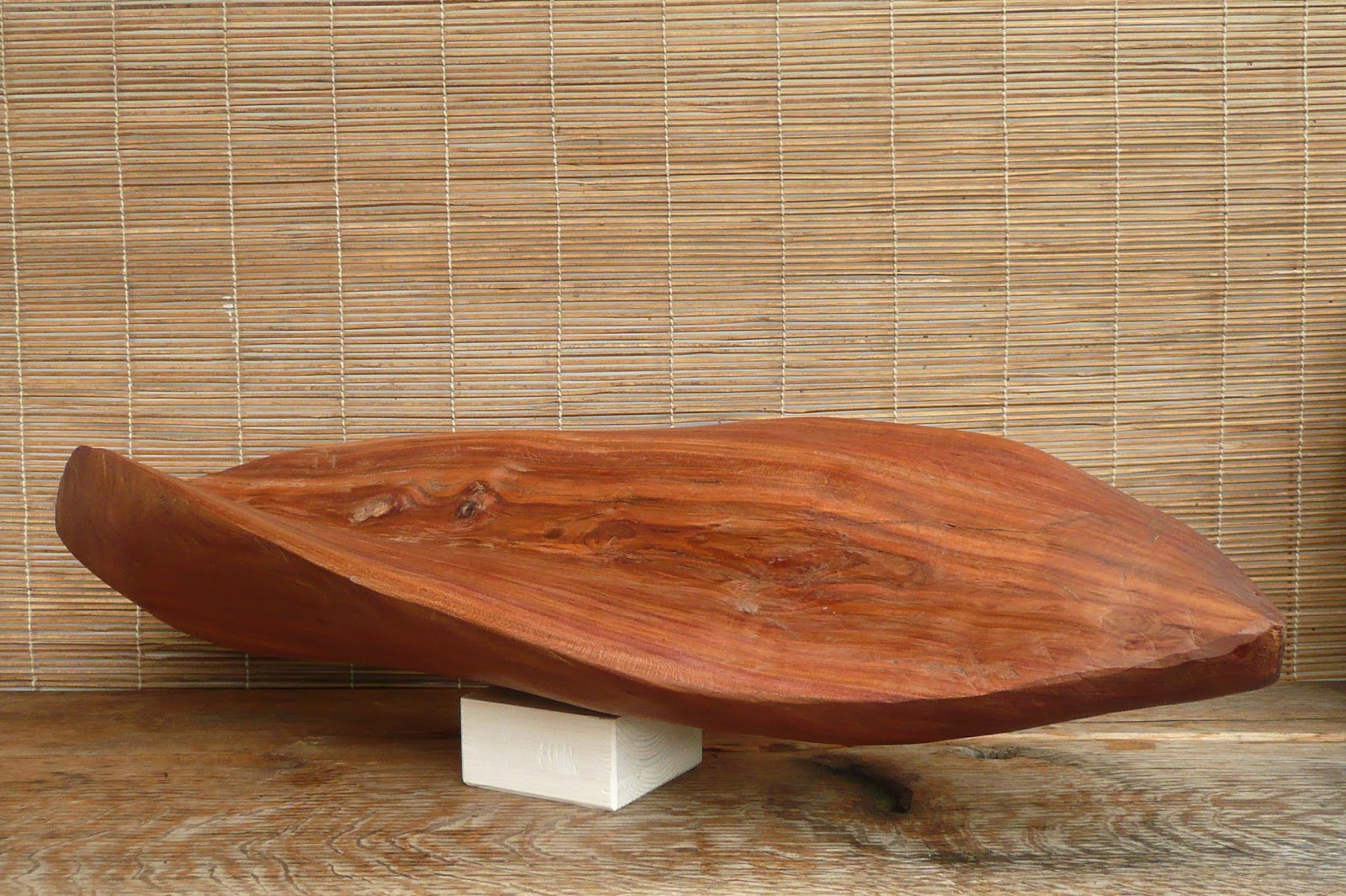 Nach einigen Steinen ist nun eine Holzskulptur fertig geworden. Die Form erinnert an ein verzogenes Boot. Das Holzstück habe ich vor vielen Jahren schon gespalten und vorgearbeitet. Es war stark verzogen und neigte zum reißen. Jetzt nachdem das Holz völlig trocken war habe ich mit vor allem mit einem Beil die endgültige Form hergestellt. Die Oberfläche ist vorwiegend mit einem Schweifhobel und mit Ziehklingen bearbeitet. Nur wenig gefeilt und geschliffen und dieses Mal bewusst etwas die Arbeitsspuren sichtbar gelassen.