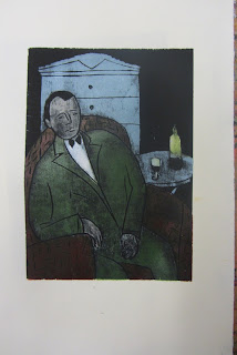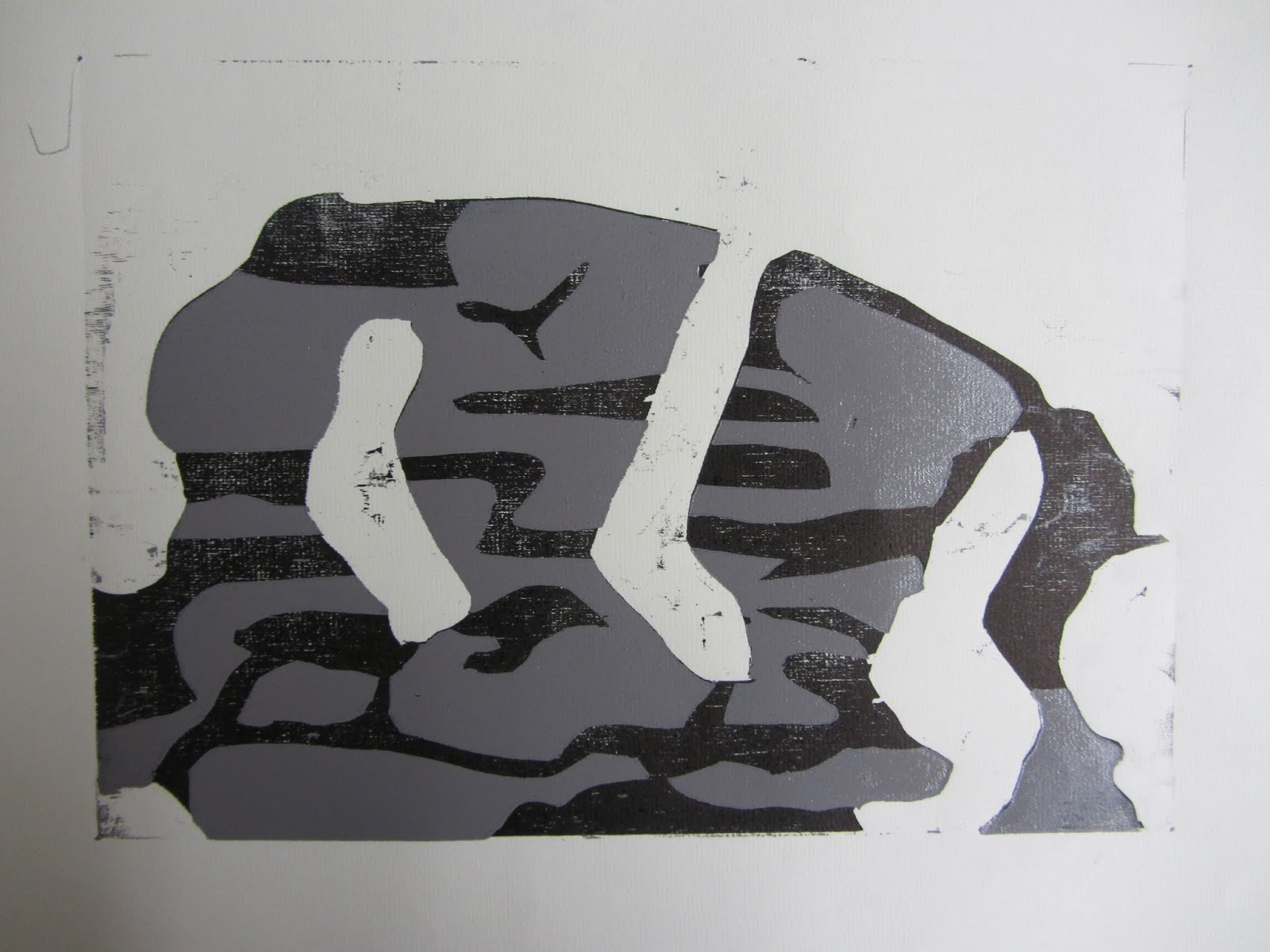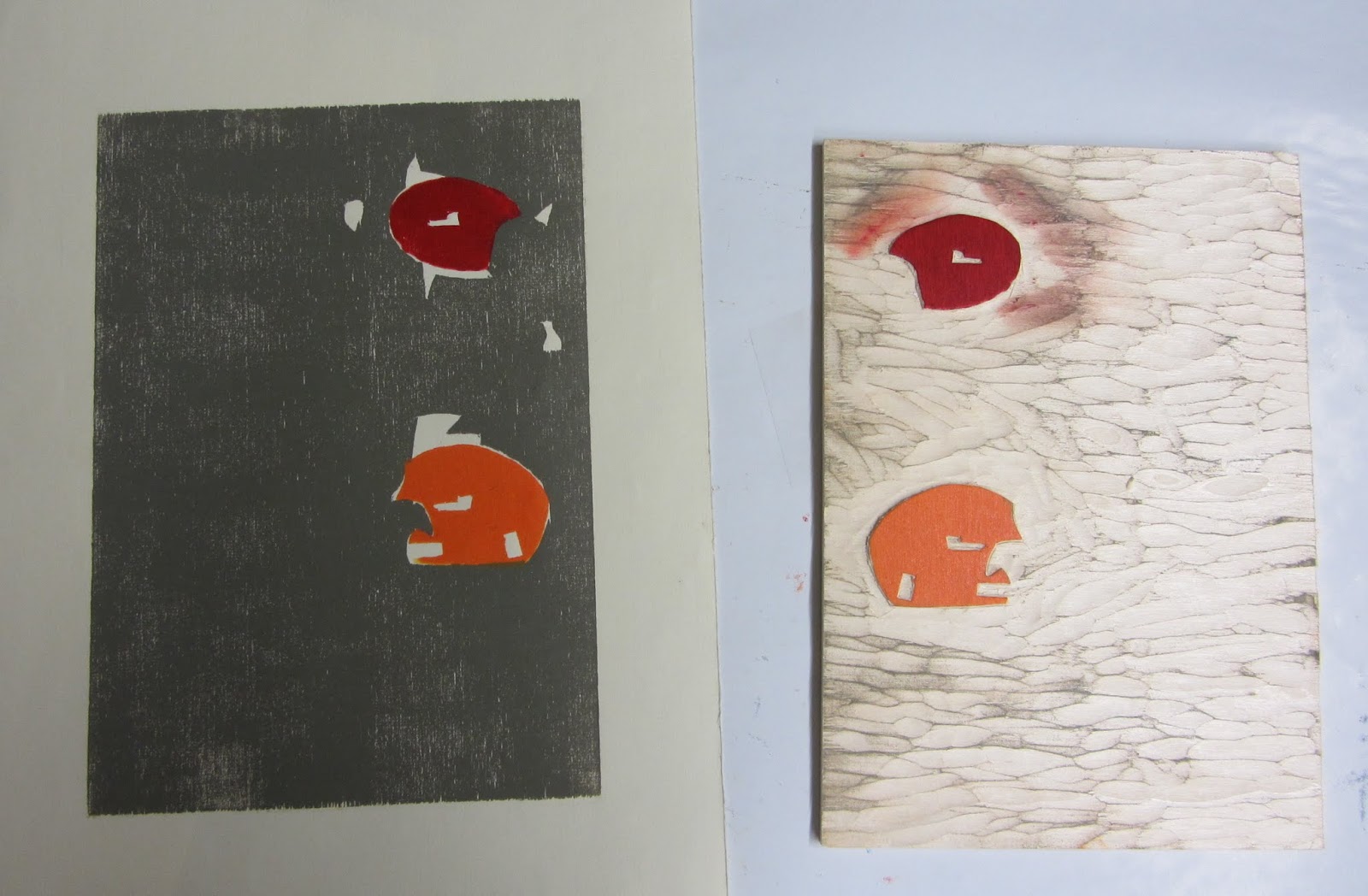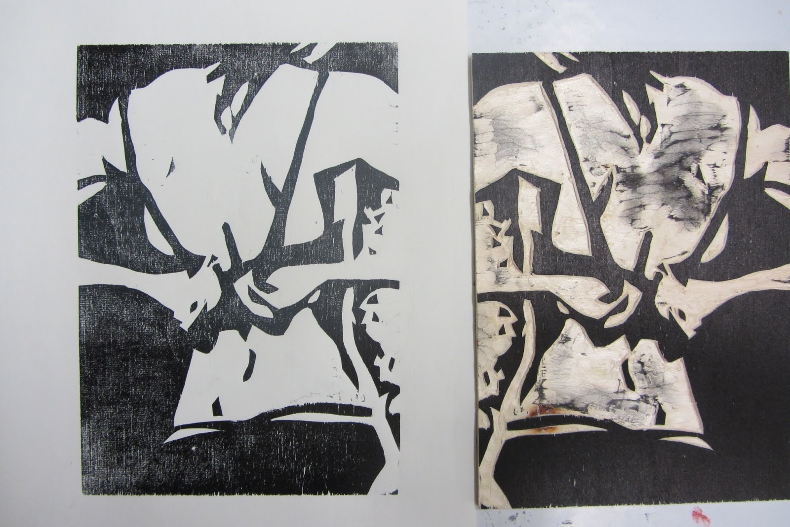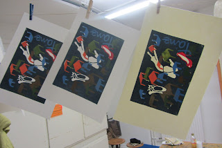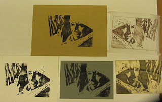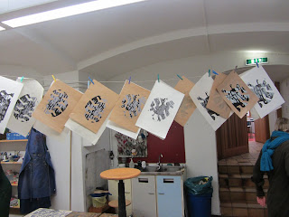 und das Winterbild von Leonie ( Probedruck mit Linolfarben) wird noch mit Ölfarben gedruckt.
