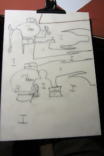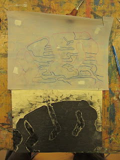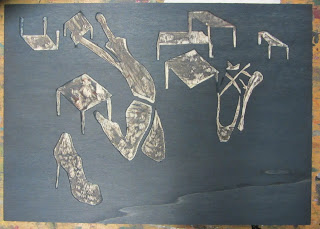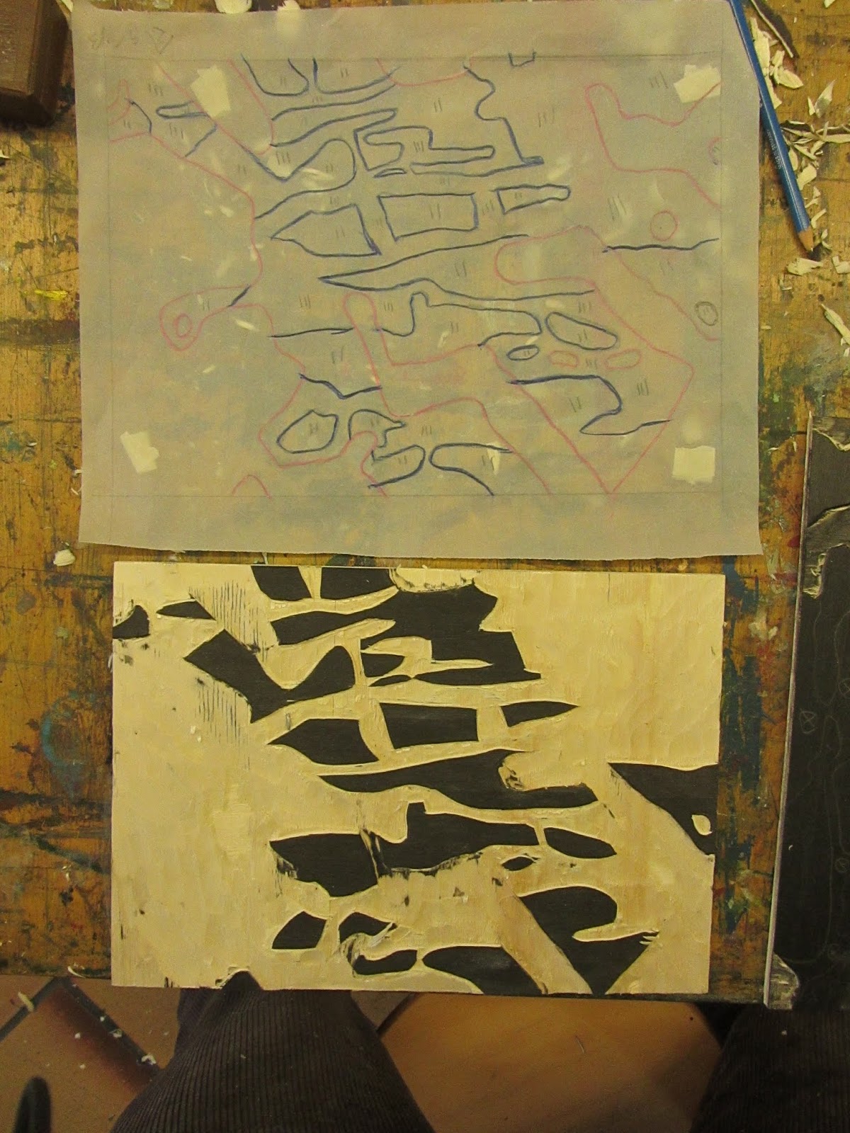 zum Thema ausgeschlüpft habe ich als Grundlage Abrücke meiner nassen Wanderschuhe aus diesem Winter als Motiv genommen. Die Abdrücke an erinnern ja auch an Fraßspuren von Larven oder noch an ganz andere Dinge. Die Schnitte sollen nach dem Prinzip der verlorenen Form entstehen. Ich habe zwei Motive mit jeweils zwei Vergrößerungsstufen ausgewählt. Die Vorzeichnungen sind jetzt fertig: